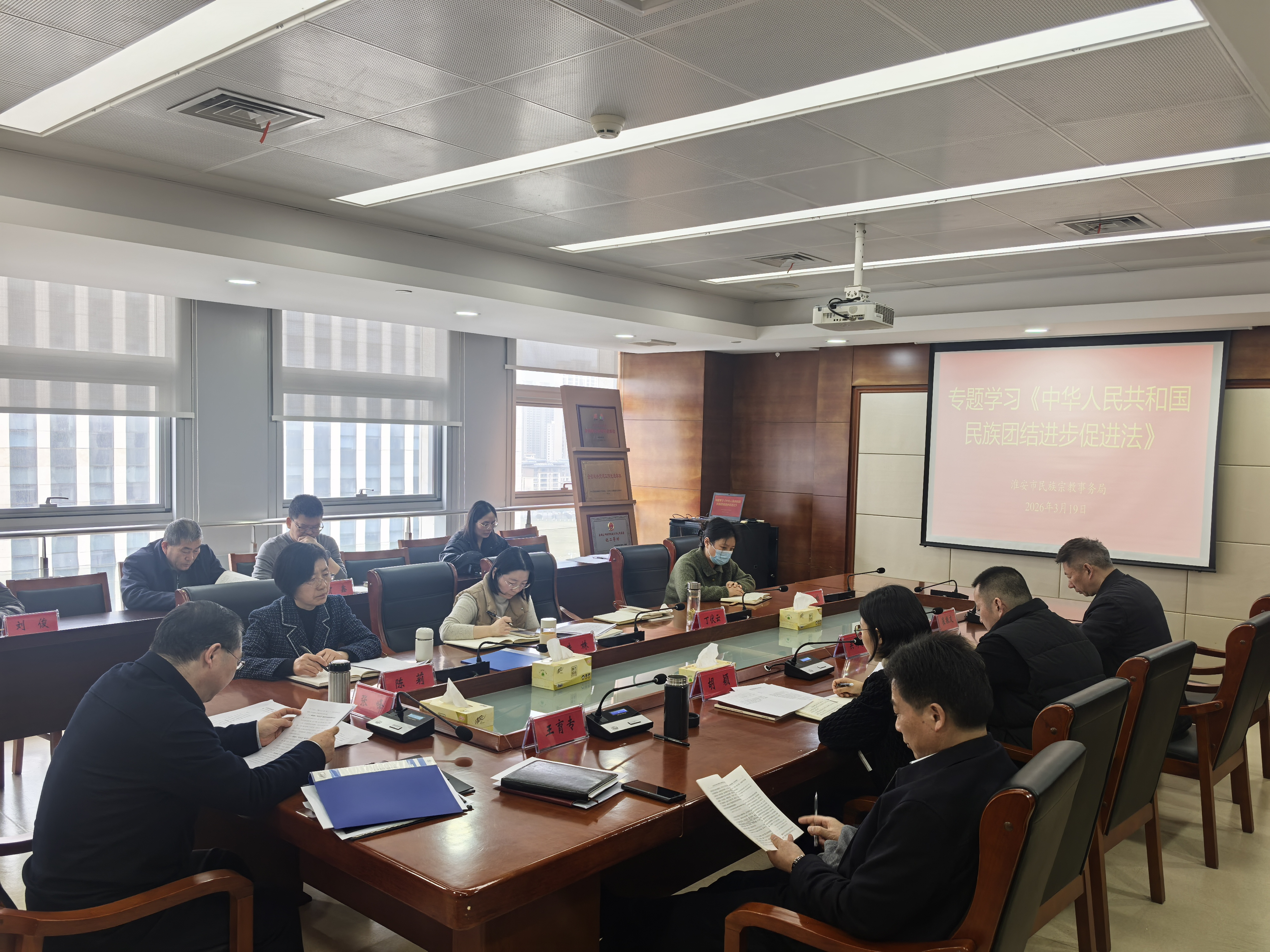 3月19日,淮安市民宗局组织召开《中华人民共和国民族团结进步促进法》专题学习会。市委统战部副部长、市民宗局局长张峰主持会议并讲话,局全体人员参加会议。