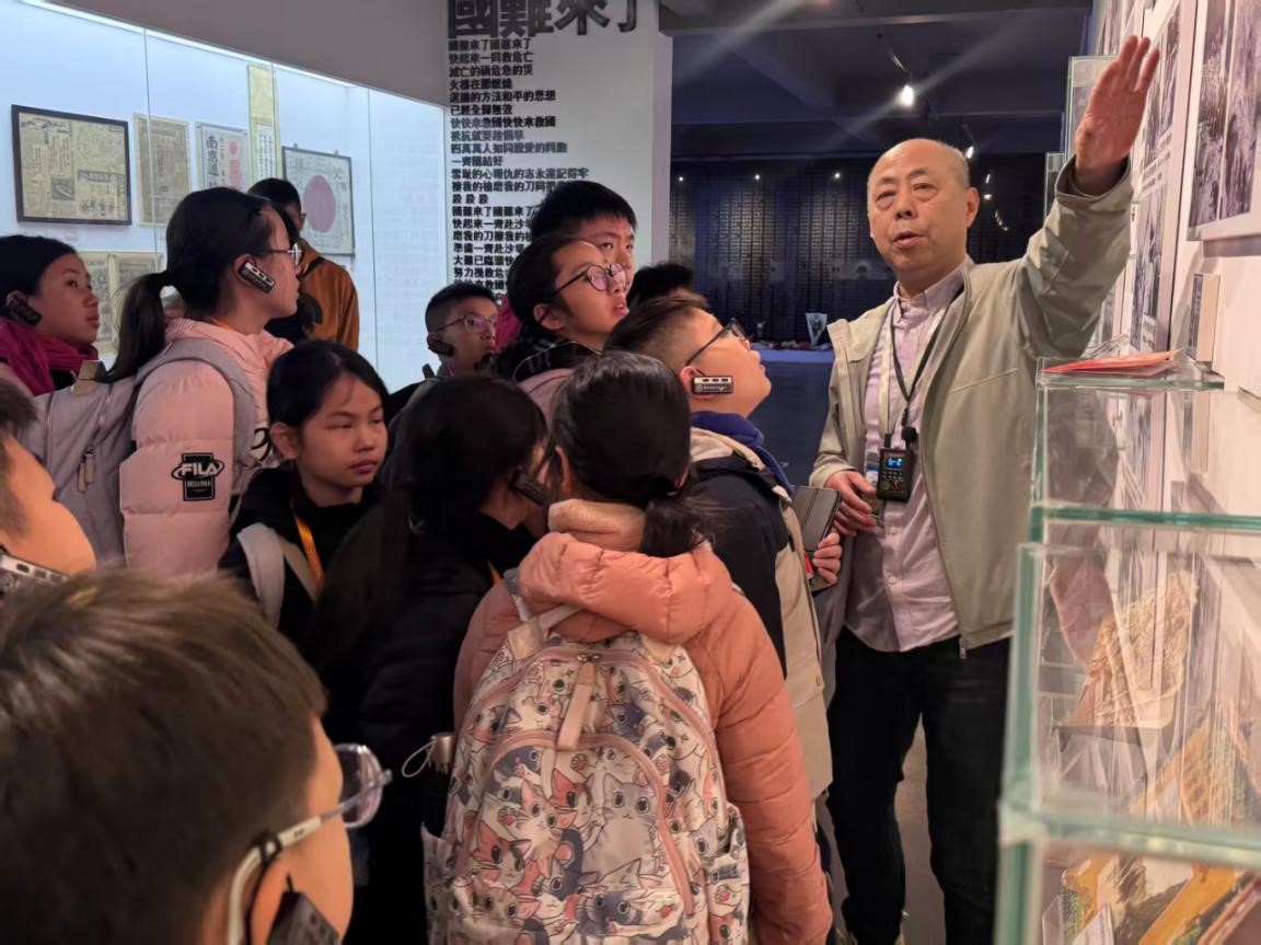 在博物馆副馆长薛刚的引导下,师生们依次参观了“1937·南京记忆”南京保卫战史实展、“不愿做奴隶的人们”抗战老兵资料展、“典籍里的红色中国”革命文献展三大核心展区。展厅内,《义勇军进行曲》巨幅词谱庄严肃穆;南京保卫战殉难将士名录墙上,密密麻麻的名字诉说着那段悲壮历史;1000余份抗战老兵鲜红手印整齐排列,如星火般夺目;1945年8月15日刊载“日本投降矣”的《大公报》号外,将胜利的喜悦定格在泛黄的纸页上。