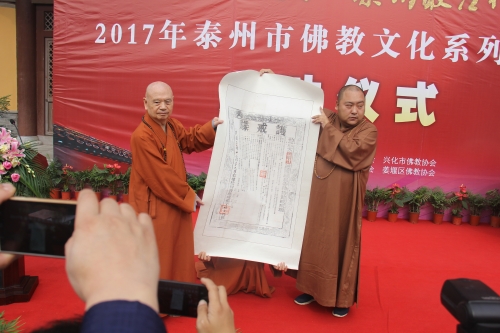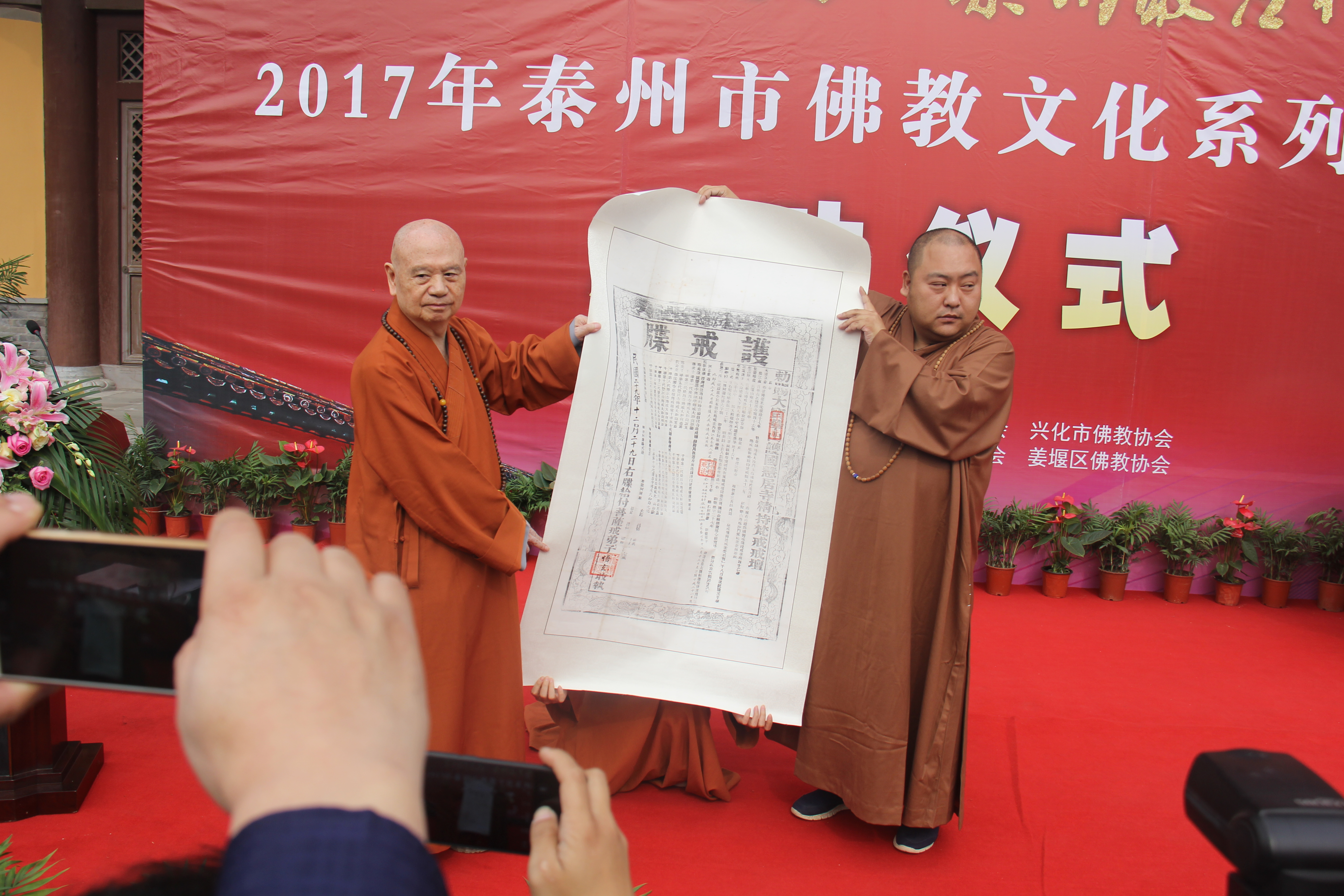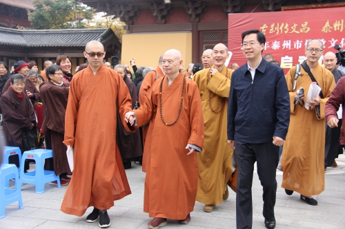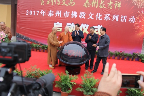 11月14 日,“古刹传文昌,泰州最吉祥”2017 年泰州市佛教文化系列活动启动仪式在光孝寺举行。世界佛教僧伽会会长、 台湾玄奘大学董事长、台北市善导寺住持了中长老,中国佛教协会副会长、省佛教协会会长、镇江金山江天禅寺、焦山定慧寺方丈心澄法师,市委副书记、统战部部长庄兆林,副市长陈明冠,省宗教局原局长翁振进等出席启动仪式。市人大、市政协相关工委,市委宣传部、市民宗局、市文广新局等部门有关人员,市级宗教团体、各市(区)佛教协会负责人及部分专家学者和信教群众200多人参加活动。