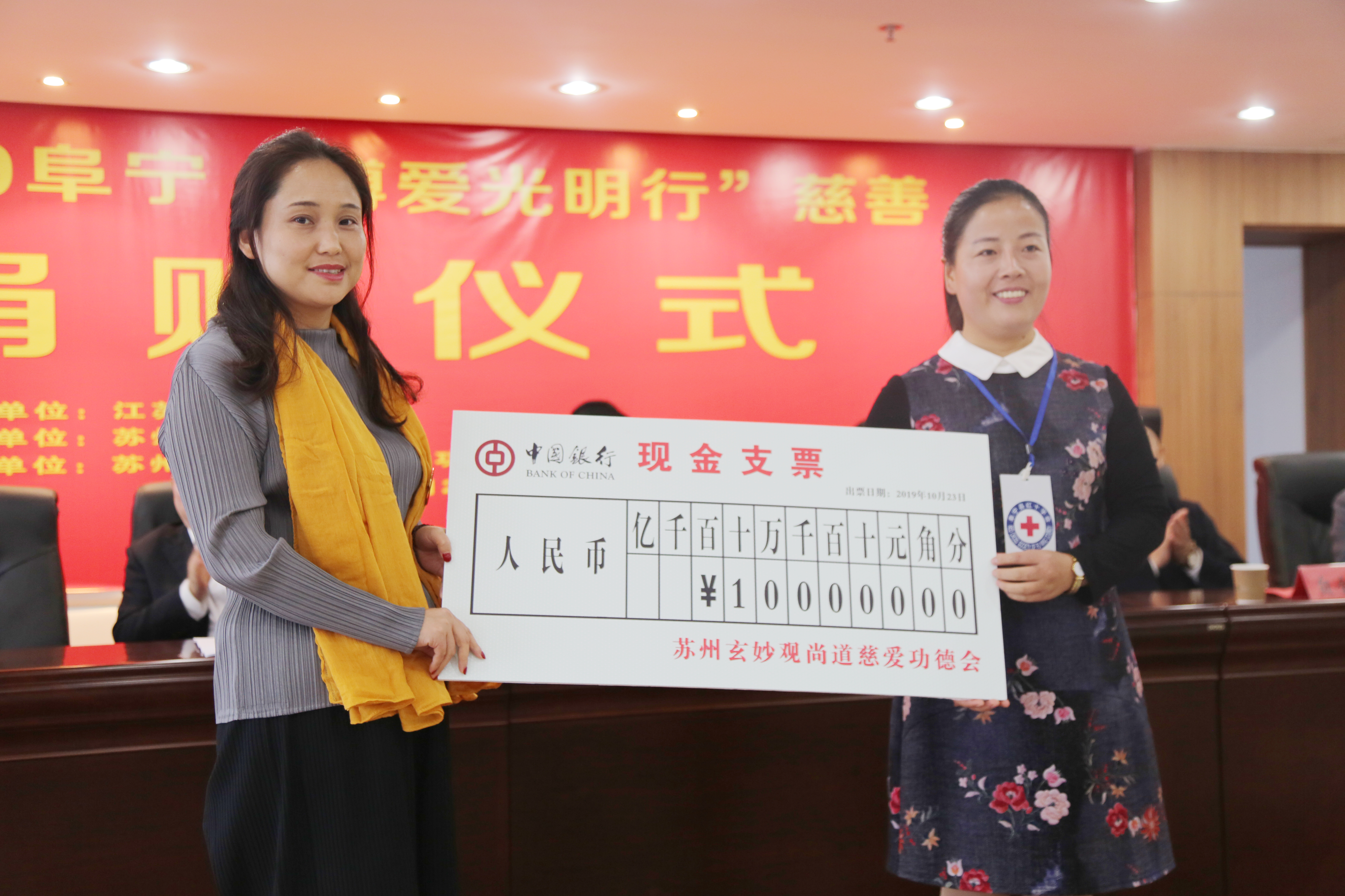 10月23日,苏州市道教协会2019“博爱光明行”慈善捐赠仪式在盐城阜宁县举行。苏州玄妙观尚道慈爱功德会向阜宁县红十字会捐资10万元,用于帮助阜宁县贫困白内障患者实施复明手术。