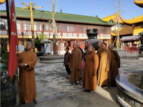二是厚植“爱国守法”情怀。推进“国旗、国歌进场所”日常化、主动化,全体教职人员庄严肃穆地参加每周“升旗仪式”,在激情的国歌声中,坚定与党和政府同心同向同行的信念。开展法律法规上墙行动,促进各项法规法律入脑入心,使遵纪守法成为宗教界人士的自觉行为。