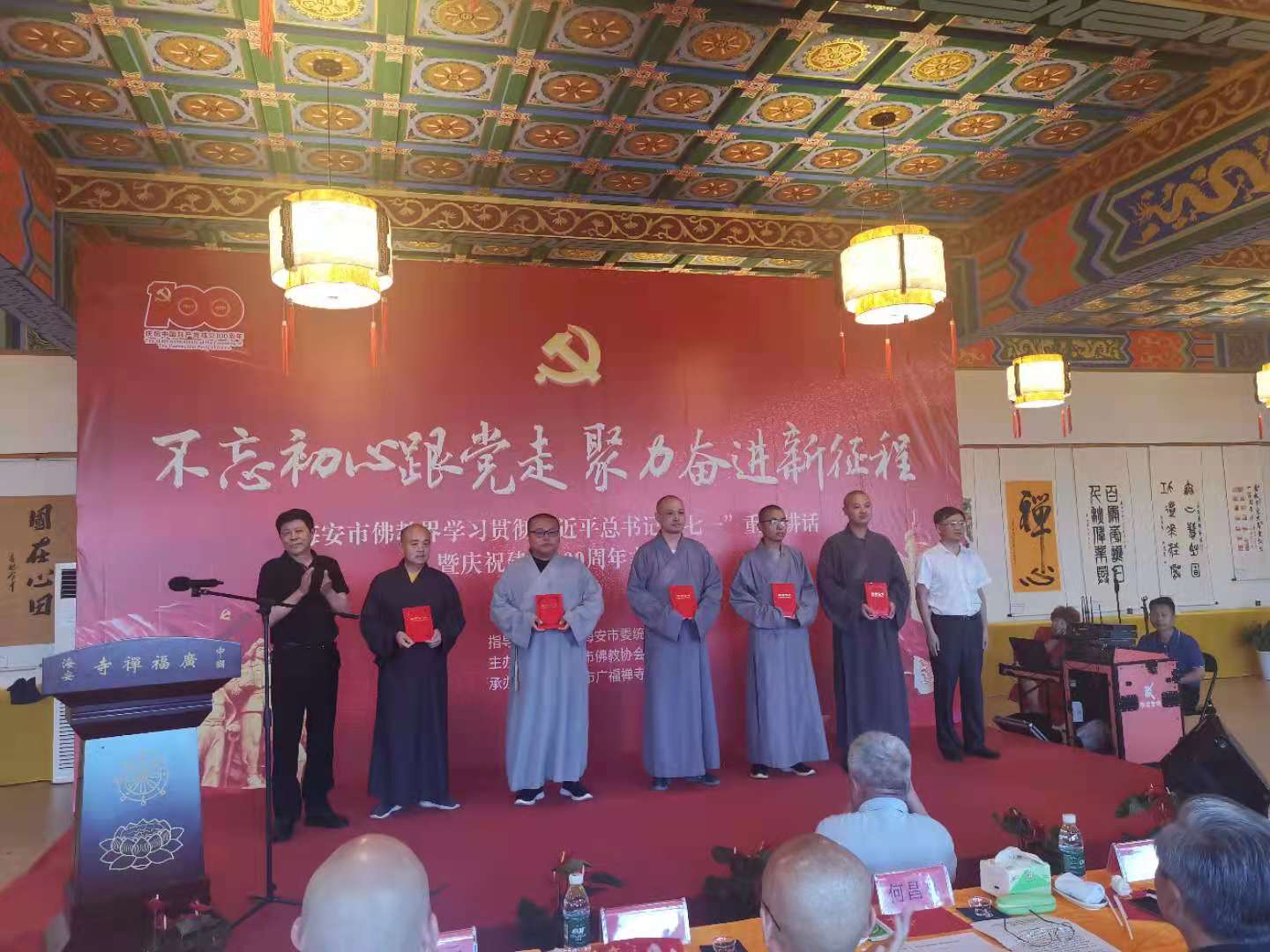 为深入学习贯彻习近平总书记在庆祝中国共产党成立100周年大会上的重要讲话精神,引导佛教界践行社会主义核心价值观,激发信教群众更加爱党爱国、正信正行,进一步坚定感党恩、听党话、跟党走的信心,同全市人民一起奋进新时代、奋斗新征程,7月14日,海安市佛教界学习贯彻习近平总书记“七一”重要讲话暨庆祝建党100周年“不忘初心跟党走 聚力奋进新征程”主题活动隆重举行。活动由南通市民宗局、中共海安市委统战部具体指导,海安市佛教协会主办,海安市广福禅寺承办。
